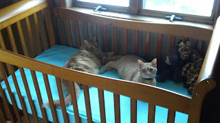 We're approaching the 25 week mark (Monday) and momma/baby are feeling good! At my last checkup, I measured a bit bigger than I should be at this week mark (not in weight, in fact I'm a little behind in that) so at my next appointment we will do another ultrasound to determine the cause. Could be that the baby's position is simply pushing outward, there is too much amniotic fluid, development of gestational diabetes OR this is just one big baby (among other possibilities)! No matter the outcome, there are relatively simply measures/procedures we can take to ensure the health of both momma and baby... so, no worries everyone... all is well :) Baby is becoming more and more active as the weeks go on and we've discovered that Leopold has quite the calming effect. He will curl up on my belly and begin purring which immediately puts the baby at ease and the kicks cease. It's a pretty comical sight to see, as Leopold is no small cat, but he's definitely a cuddler and I appreciate his ability to calm our little peanut down... (s)he is getting big enough to where some of those kicks/punches are a little uncomfortable! Both of the cats have also taken to sleeping in the new nursery. They've quickly made the crib their own and are often found snuggling with the baby's teddy. Once the baby is big enough, I have a feeling all three of them will be cuddled up together :)